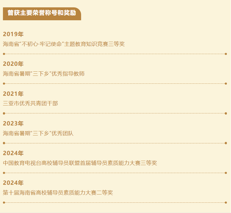自入职三亚学院以来,李静茹老师先后在校团委、健康产业管理学院工作,现任健康产业管理学院团委副书记、健康产业管理学院学生党支部书记。她在日常工作中注重深化青年学子的理想信念教育,平时利用主题教育、座谈会、朋辈引领等多种途径和形式多样的各类活动开展大学生思想政治教育,引导学生树立正确的世界观、人生观和价值观,培养学生综合素质和内在涵养。积极开展思想政治教育专题研究,参与结项海南省社会科学研究(思政专项)课题《大学生党员在高校思想政治教育工作中的作用探究—基于领导力的维度》;参与申报2025年度海南省哲学社会科学规划课题(思政专项)课题《产教融合背景下基于五育并举的大学生心理健康服务体系研究》,已立项。此外她积极参加思想政治教育类职业技能大赛,2024年5月荣获中国教育电视台首届高校辅导员素质能力大赛全国三等奖;2024年6月获得海南省高校辅导员素质能力大赛二等奖;2020年海南省暑期“三下乡”优秀指导教师;2021年三亚市优秀共青团干部;2023年海南省暑期“三下乡”优秀团队等荣誉称号。